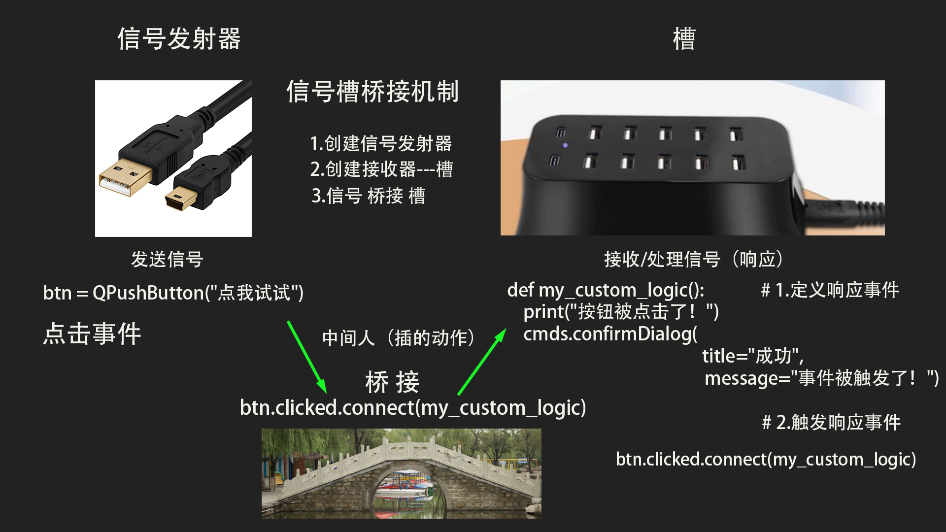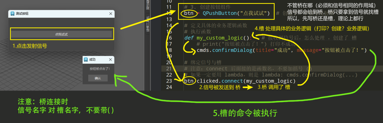 QPushButton是信号发射器,自定义函数 my_custom_logic 是槽,btn.clicked.connect(...)是桥接